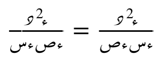 عادةً يمكن تبديل ترتيب الاشتقاق الجزئي (أي اشتقاق الدالة أولاً بالنسبة لمتغيّر ثم بالنسبة لآخر أو العكس) إذا كانت الدالة مستمرة وقابلة للاشتقاق بشكل كافٍ في المنطقة المدروسة. في هذه الحالة، تكون المشتقات الجزئية المختلطة متساوية، أي أن: