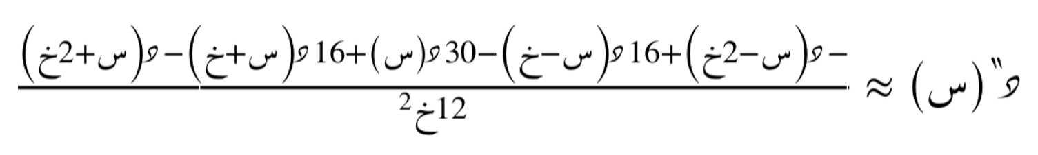يُمثّل هذا التقريب صيغة متقدّمة للفروق المركزية للمُشتقة الثانية، حيث يأخذ في الاعتبار حدود المتسلسلة حتى الدرجة الرابعة، ويعتمد على قيم الدالة في نقاط متعددة حول النقطة المدروسة، وليس فقط على النقاط السابقة أو اللاحقة مباشرةً. يتيح هذا الأسلوب تحسين دقّة التقريب بشكل ملحوظ مقارنةً بالطرق الأبسط، ويُستخدم في التطبيقات التي تتطلّب تقديراً عددياً عالي الدقّة للمُشتقات.