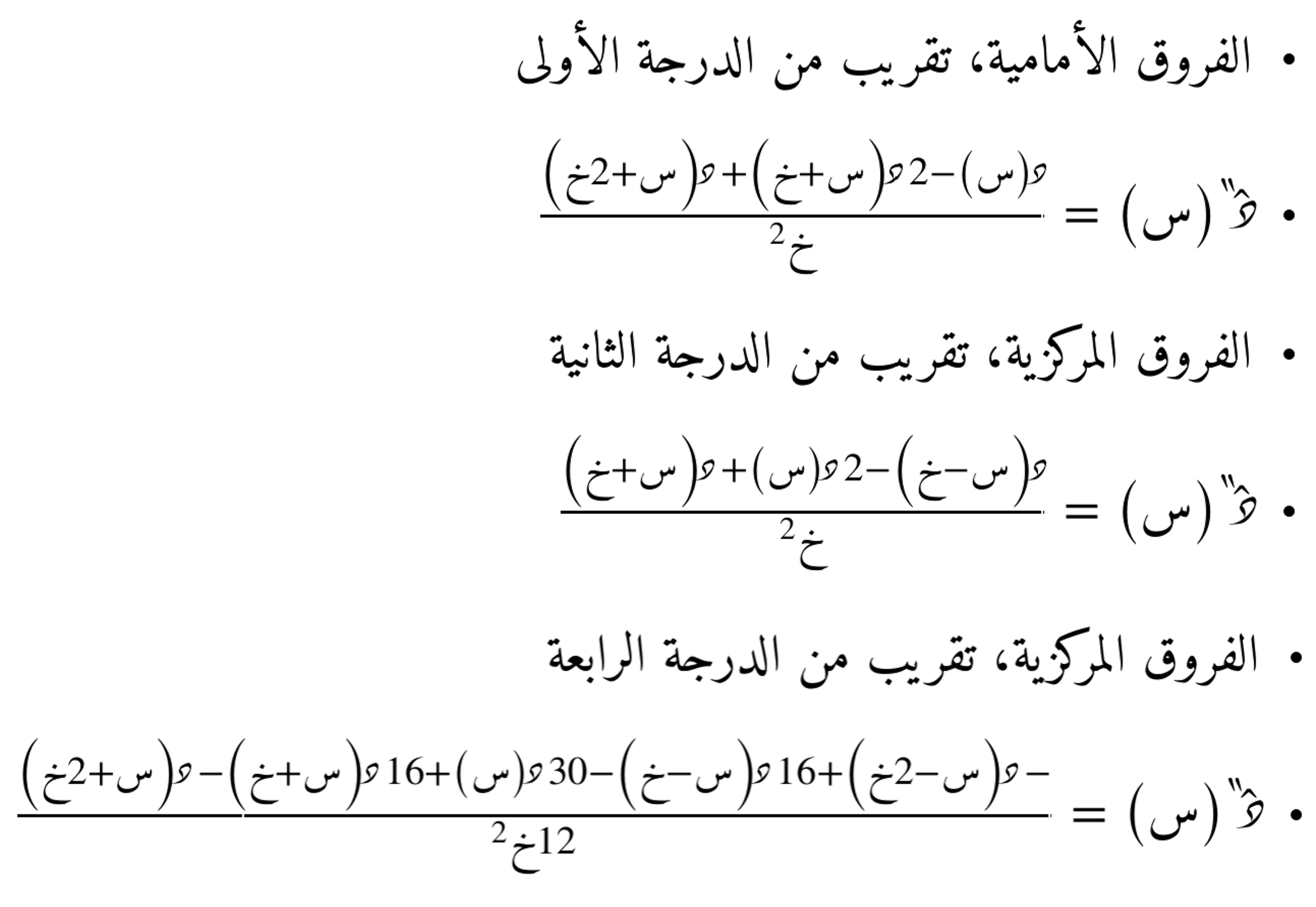 فيما يلي صيغة المتسلسلة الحدودية التفاضلية مع توسّع أكبر للخطوة، حيث تشمل حدودًا أعلى مثل خُطوتين أو ثلاث أو أربع، مما يسمح بالحصول على تقريبات عددية أكثر دقة للمشتقات من رتب أعلى. هذا التوسّع يُستخدم في التحليل العددي لتقليل مقدار الخطأ وزيادة موثوقية النتائج، خاصة عند التعامل مع دوال ذات تغيّر سريع أو عند الحاجة إلى تقديرات دقيقة للمشتقات في التطبيقات العلمية والهندسية.